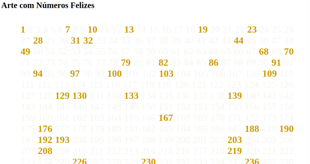 Por fim, no link, uma rotina em Javascript para formatar em amarelo ouro os números felizes. O efeito final é bem legal, provavelmente deixará os números mais felizes ainda!