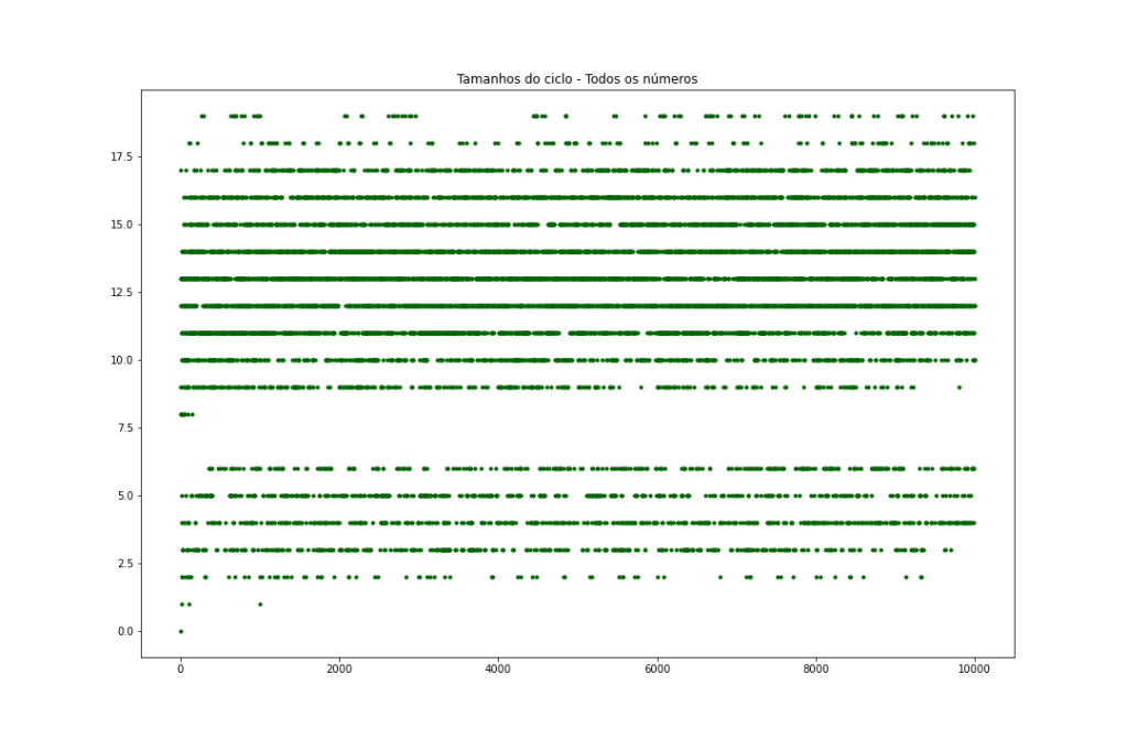 No gráfico, estão plotados o tamanho do ciclo no eixo y, para cada número Feliz no eixo x, até o número 10.000. Nota-se que há um padrão: o ciclo vai de 1 a 6 no intervalo testado, o que mostra que a convergência é bem rápida.