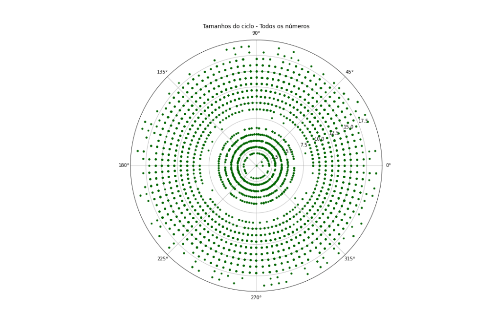 Este gráfico representa os números Felizes. O ângulo é arbitrário, indo de zero a 360 graus para x = 100, e se repetindo. E o raio é o tamanho do ciclo de cada número.