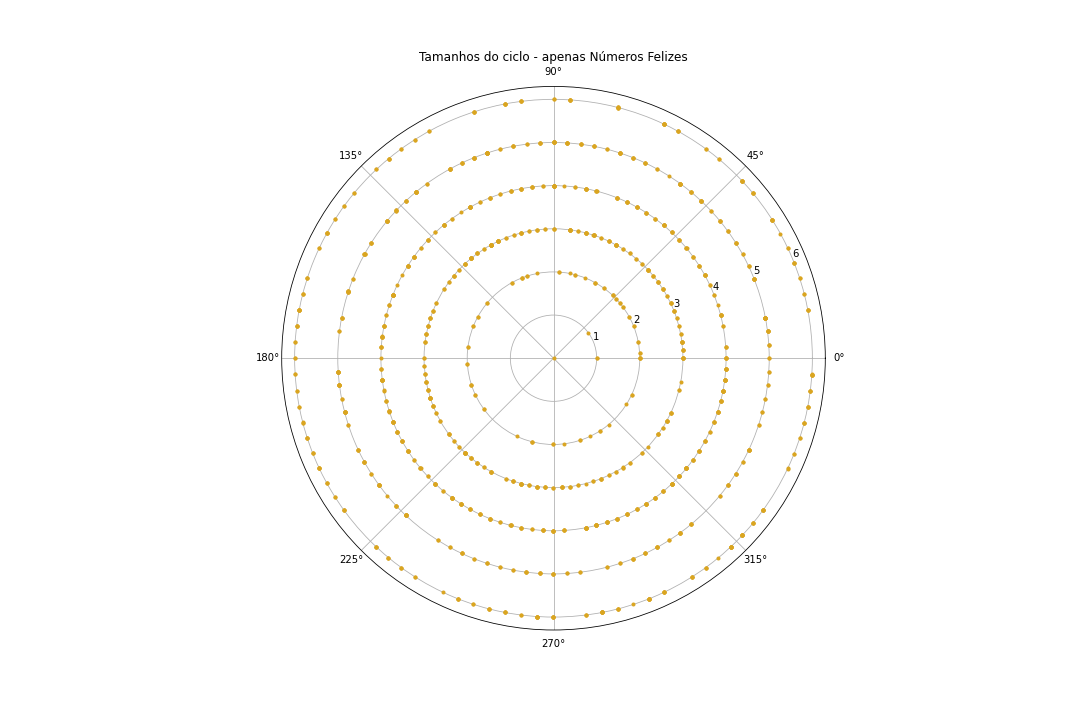 Este gráfico representa os números Felizes. O ângulo é arbitrário, indo de zero a 360 graus para x = 100, e se repetindo. E o raio é o tamanho do ciclo de cada número.