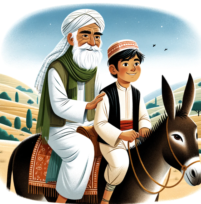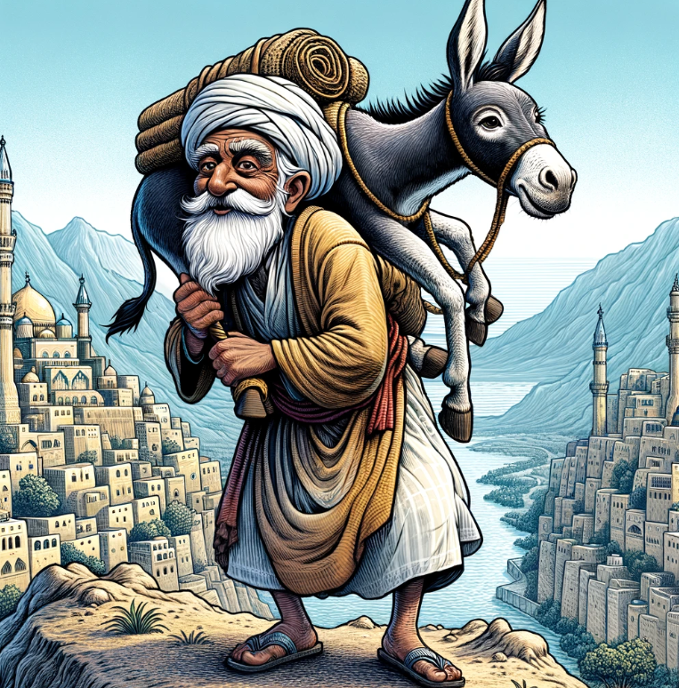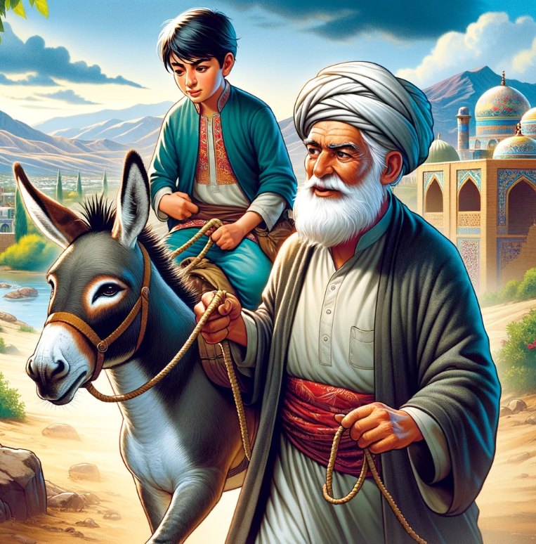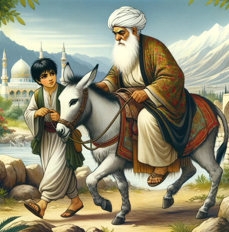 A história começa com Nasrudin e seu filho viajando com sua mula para o mercado. Inicialmente, Nasrudin decide andar enquanto seu filho monta a mula. Ao passarem por algumas pessoas, ouvem críticas de que o jovem não tem respeito pelos mais velhos: