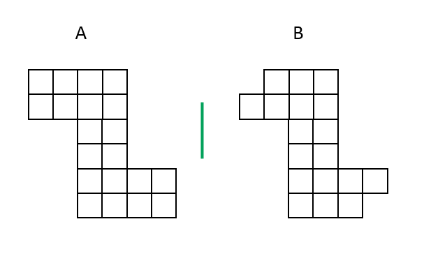 Podemos cobrir a forma da Figura A, à esquerda, com 10 dominós (de dimensões 2 quadrados de largura por 1 de altura, podendo girar 90 graus).