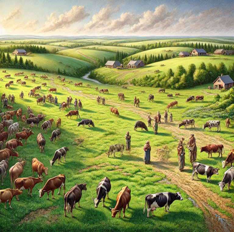 1 – No começo, um recurso compartilhado (como um campo de pastagem) está disponível em quantidade suficiente. Todos os que usam o recurso fazem isso de maneira moderada e o recurso é suficiente para todos.