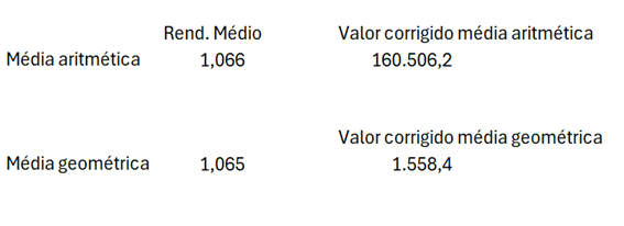 Se eu calcular o montante final por montante_inicial*(rendimento_médio)^n, terei os valores a seguir, mostrando que o valor corrigido pela média geométrica é a que dá o valor correto.