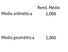 Se utilizarmos a média aritmética, dá 1,066, ou 6,6%.