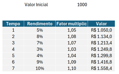 Digamos que eu tenha um montante inicial de R$ 1000,00, e que eu tenha obtido os seguintes retornos, a cada ano.