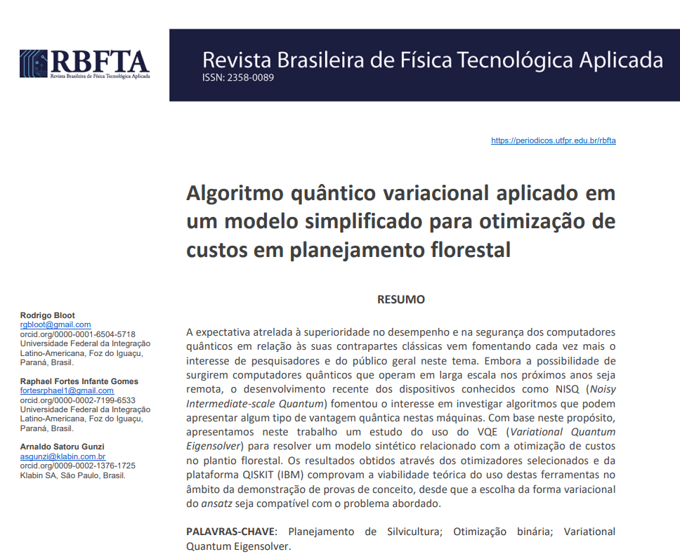 Recomendo o artigo que publiquei recentemente em colaboração com os professores doutores Rodrigo Bloot e Raphael Fortes: “Algoritmo quântico variacional aplicado em um modelo simplificado para otimização de custos em planejamento florestal”, publicado na Revista Brasileira de Física Tecnológica Aplicada.
