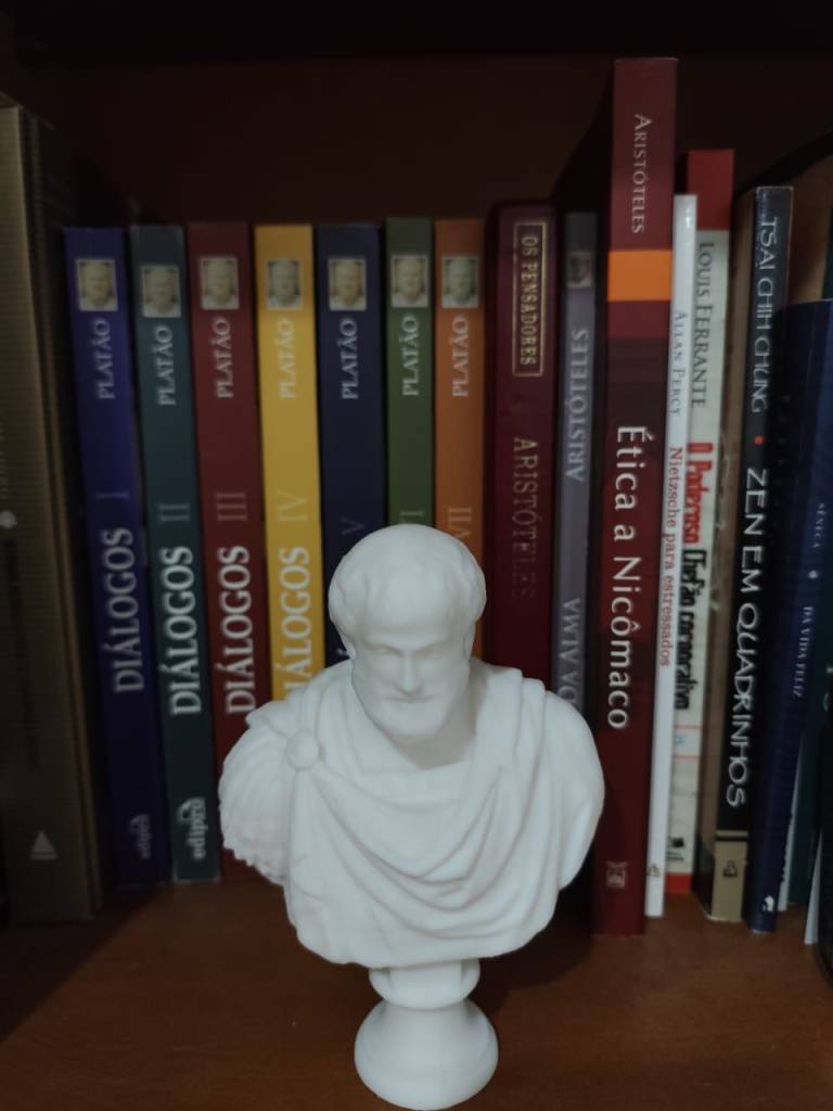 A seguir, foto do “Pequeno Aristóteles”. Miniatura em homenagem ao grande filósofo, impresso em 3D pelo amigo Thiago Cabriote.