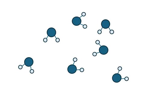 A água no formato de vapor, gás, é como se fossem partículas se movendo e se chocando umas contra as outras, em grande velocidade – portanto, grande espaçamento entre elas.
