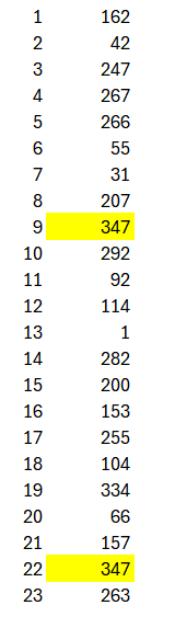 [ 9, 9, 14, 39, 52, 73, 97, 138, 140, 142, 157, 164, 186, 207, 217, 250, 259, 273, 293, 313, 320, 348, 359]