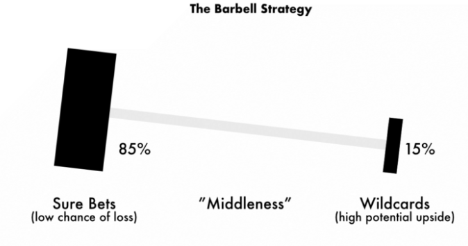 O “barbell” remete à imagem de uma barra de pesos: ser extremamente conservador em um extremo (digamos, 90% do investimento em títulos bastante sólidos, renda fixa, ouro) e extremamente agressivo em outro extremo (digamos 10% do investimento em opções de alta volatilidade).