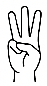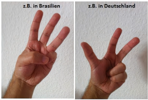 A resposta do garçom foi um “three”, fazendo sinal de três… em alemão (com o dedão e dois dedos).