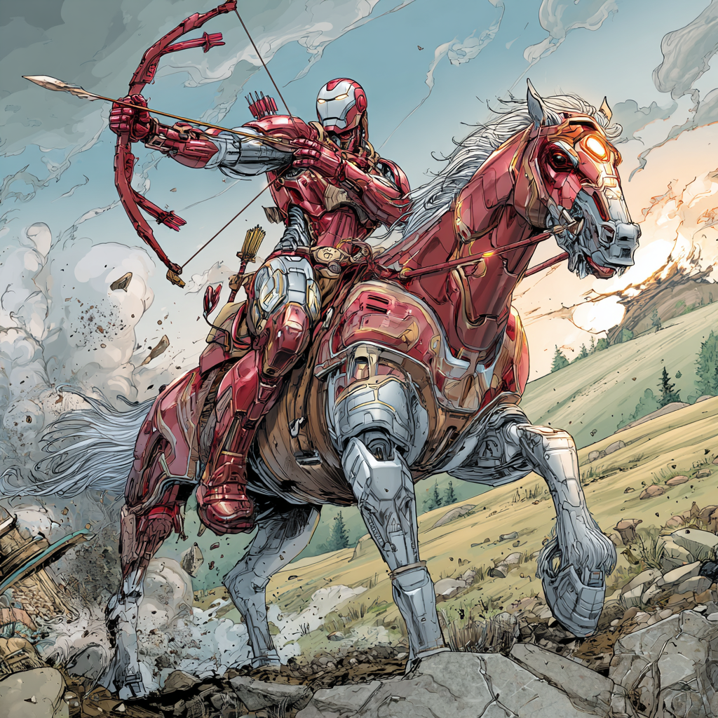 Enquanto isso, uso a IA para fazer o desenho de um homem de ferro em um cavalo tecnológico, portando arco e flecha…