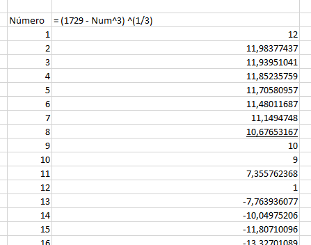 O jeito mais simples é fazer a conta (1729 – num^3)^(1/3), e ver se o resultado é inteiro, para todos os números de 1 a 1729. Vide Excel anexo.