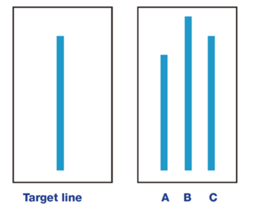 Qual das linhas (A, B ou C) tem tamanho parecido com a linha alvo da esquerda? Em 1951, Solomon Asch colocou uma sala com 6 atores e uma cobaia, que não sabia que os demais tinham uma resposta combinada. Todos falavam em voz alta, uma resposta errada, e a pessoa a ser testada ficava próximo …